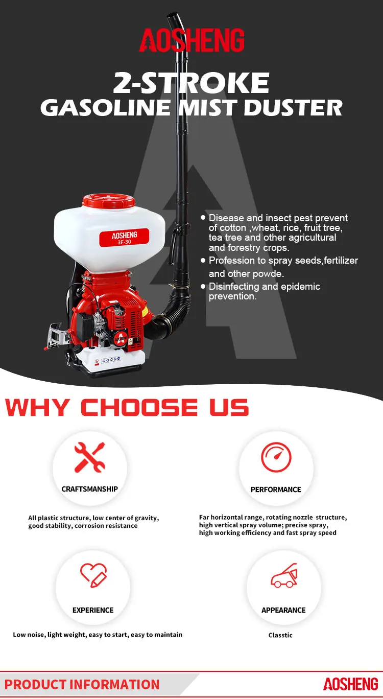 AOSHENG 2 stroke gasoline mist sprayer gas garden tools high quality 30L seed and fertilizer planter disinfection mist dusterAOSHENG 2 stroke gasoline mist sprayer gas garden tools high quality 30L seed and fertilizer planter disinfection mist dusterAOSHENG 2 stroke gasoline mist sprayer gas garden tools high quality 30L seed and fertilizer planter disinfection mist duster